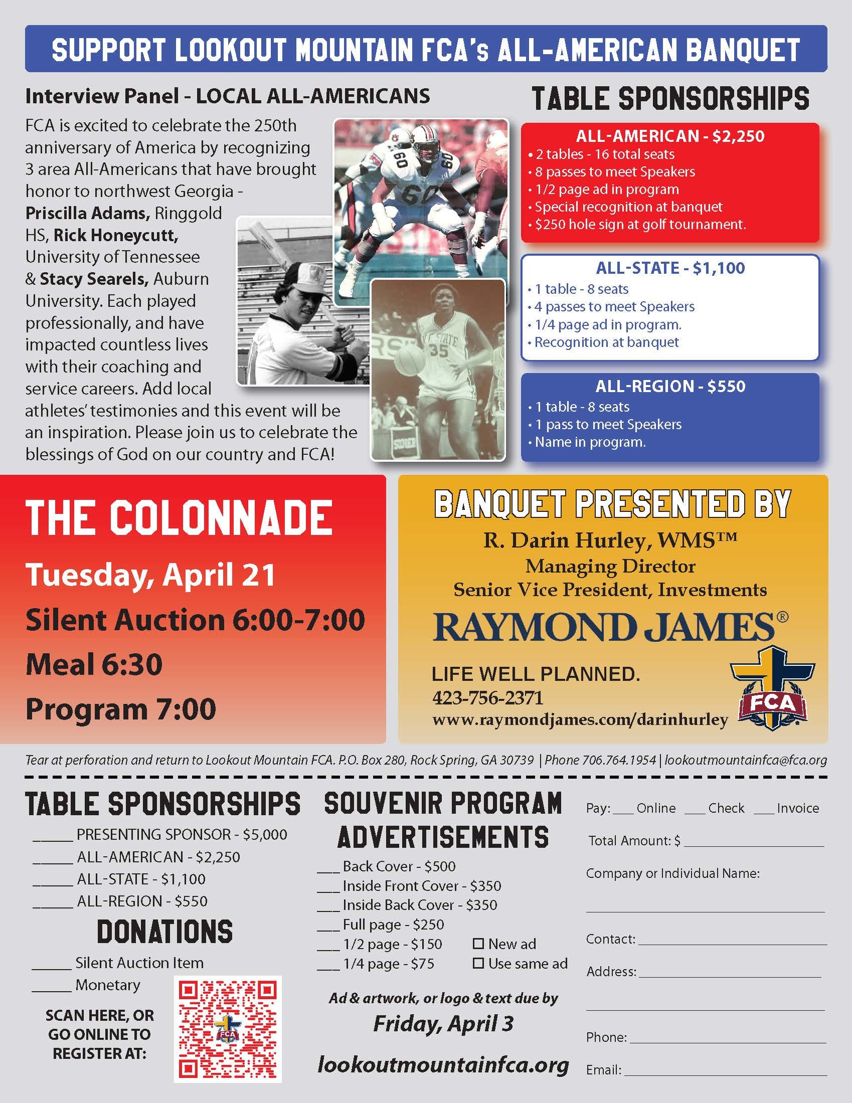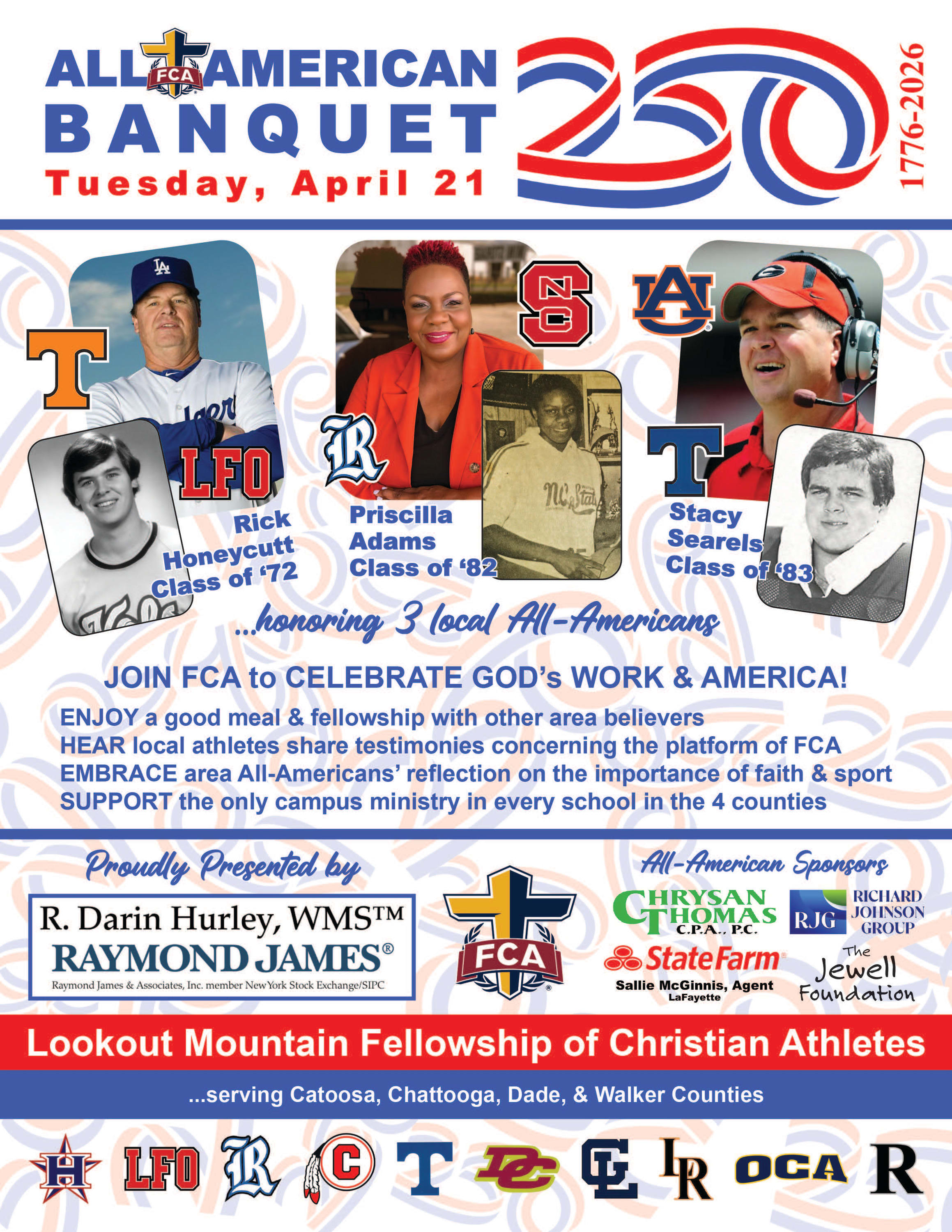 Join the Lookout Mountain Fellowship of Christian Athletes for a special evening honoring three outstanding local All-Americans who have made a lasting impact on our region and beyond.