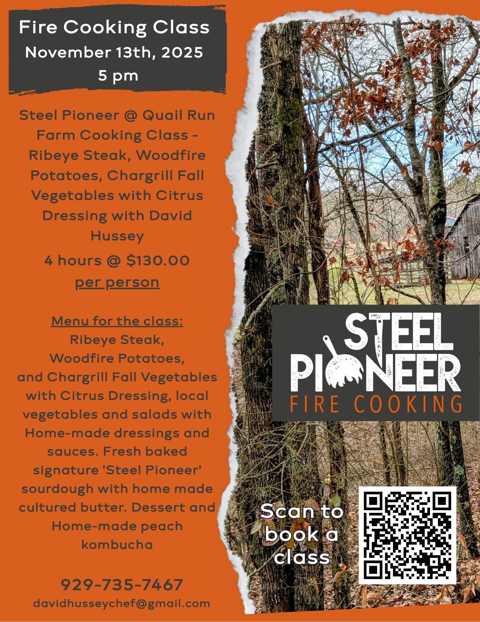 Join Steel Pioneer Fire Cooking at Quail Run Farm for an unforgettable hands-on experience with award-winning UK Chef David Hussey!